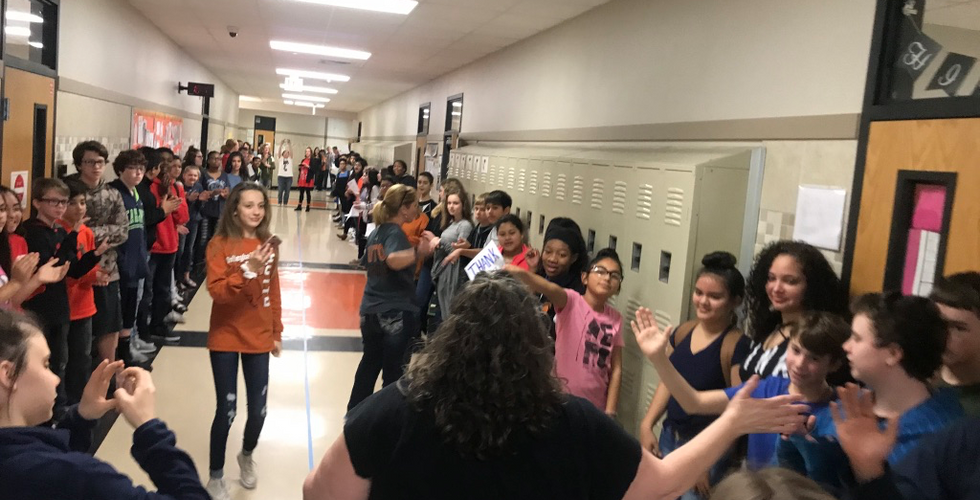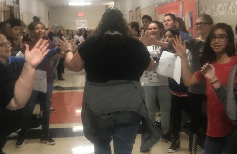 All of that hard work does not go unnoticed so students chose to throw Mrs. Dora a campus wide parade! She was taken on a walk through the halls of HMS and honored with cheers, chants and signs all the way through.
